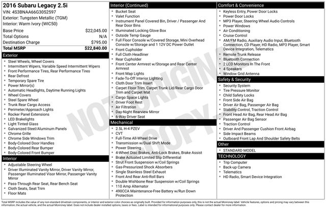 2016 Subaru Legacy 2.5i Tungsten Metallic 2.5L 4-Cylinder DOHC 16V AWD CVT Lineartronic